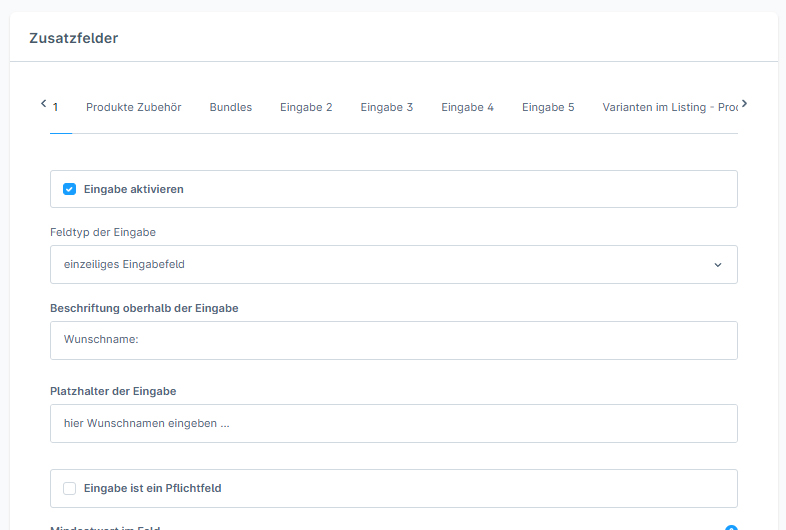 Diese sind schnell unter dem Produkt Zusatzfelder Eingabe 1 - 5 aktivierbar. Unterstützt verschiedene Feldtypen (Text, Checkboxen etc.) – für jede Branche anpassbar.