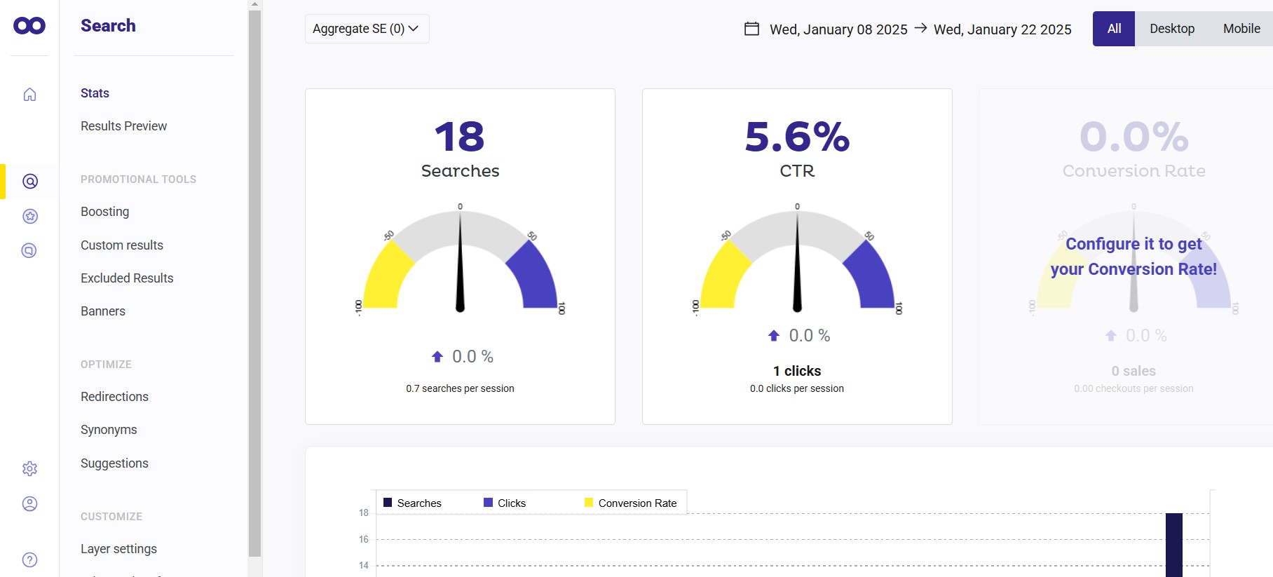 Im DooFinder-Admin-Panel kannst du ganz einfach die Suchanfragen deiner Nutzer auswerten. Du bekommst einen schnellen Überblick über Suchanfragen, Top-Ergebnisse, meistgeklickte Produkte, ungenutzte Chancen und Suchbegriffe ohne Treffer. So kannst du gezielt Maßnahmen ableiten, um dein Sortiment zu optimieren, neue Produkte zu ergänzen oder deine Suche noch besser auf die Bedürfnisse deiner Kunden abzustimmen.