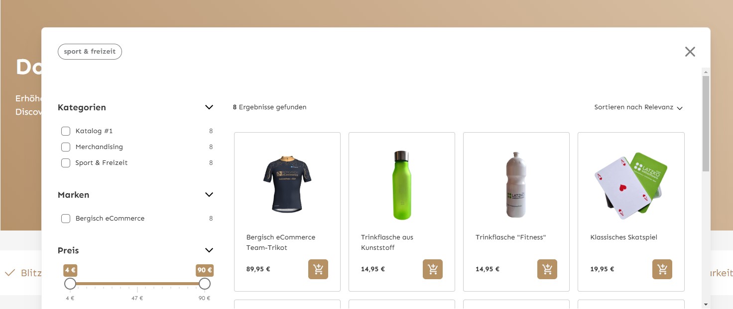 Dir stehen verschiedene Filteroptionen zur Verfügung – zum Beispiel nach Kategorien, Marken oder Preis. Außerdem kannst du die Akzentfarben für Schaltflächen, Links, Texte und Filter ganz individuell an dein Design anpassen. Die Produktverfügbarkeit lässt sich übersichtlich darstellen und Rabatte kannst du mit auffälligen Badges besonders hervorheben. Für noch mehr Komfort kannst du sogar den Warenkorb-Button direkt in die Suche integrieren – so machst du es deinen Kunden noch einfacher.